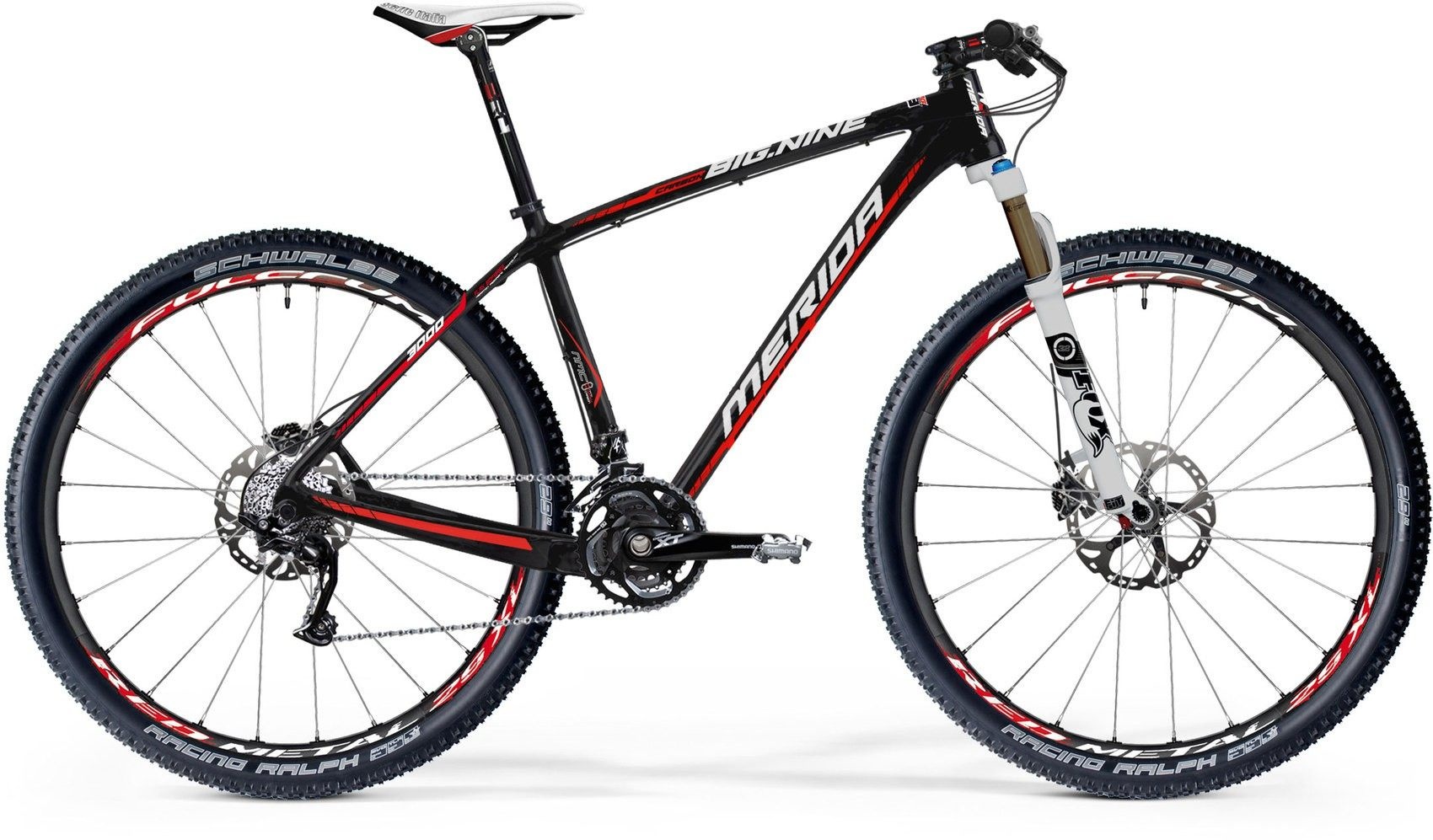 Хардтейл (горный/кросс-кантри) Merida Big Nine Carbon 3000 с колесами диаметром 29 дюймов. Воздушно-масляная вилка профессионального уровня Fox 32 Float 29 CTD Fit- Performance с ходом 100 мм. Найнер имеет 30 скоростей; оборудован любительским задним переключателем Shimano Deore XT, дисковыми гидравлическими тормозами профессионального уровня Shimano Deore XT (180 мм).