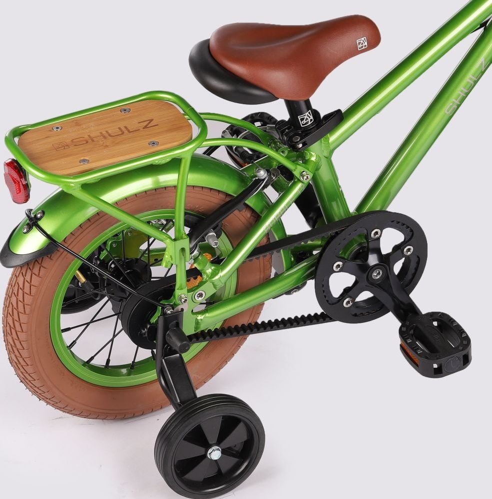 У этого велосипеда уже все, как у взрослых — надежные тормоза на обоих колесах, багажник для перевозки вещей, седло с быстрой регулировкой по высоте и кожаные грипсы. Ременная передача не только делает велосипед легче, но и безопаснее для малыша — об ремень, в отличие от цепи, он никогда не поранится и не испачкается. В комплекте приставные колеса и набор инструментов.